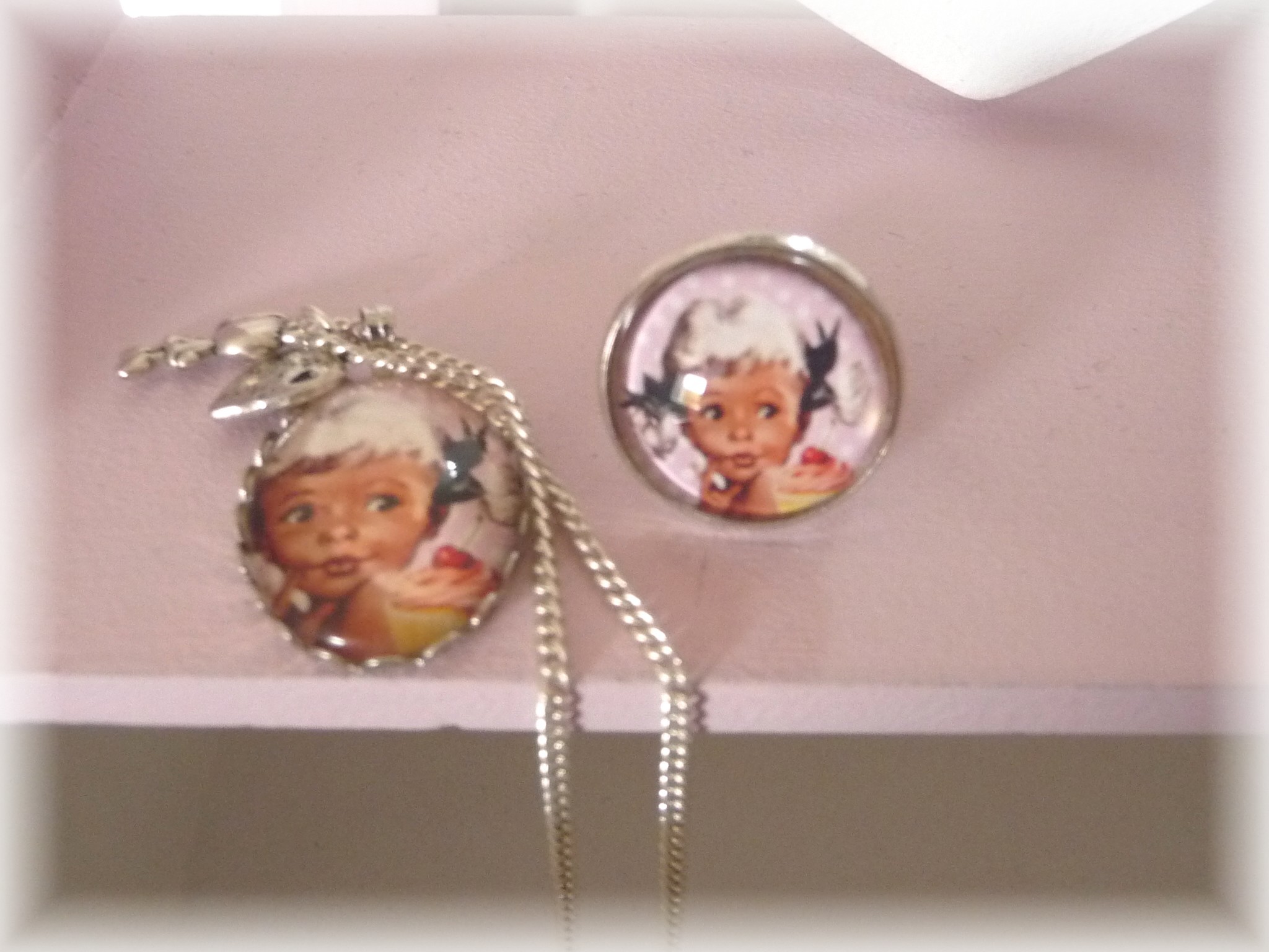 - un collier pendentif avec cabochon fait main, petit coeur et fillette, fine chaine en métal argenté