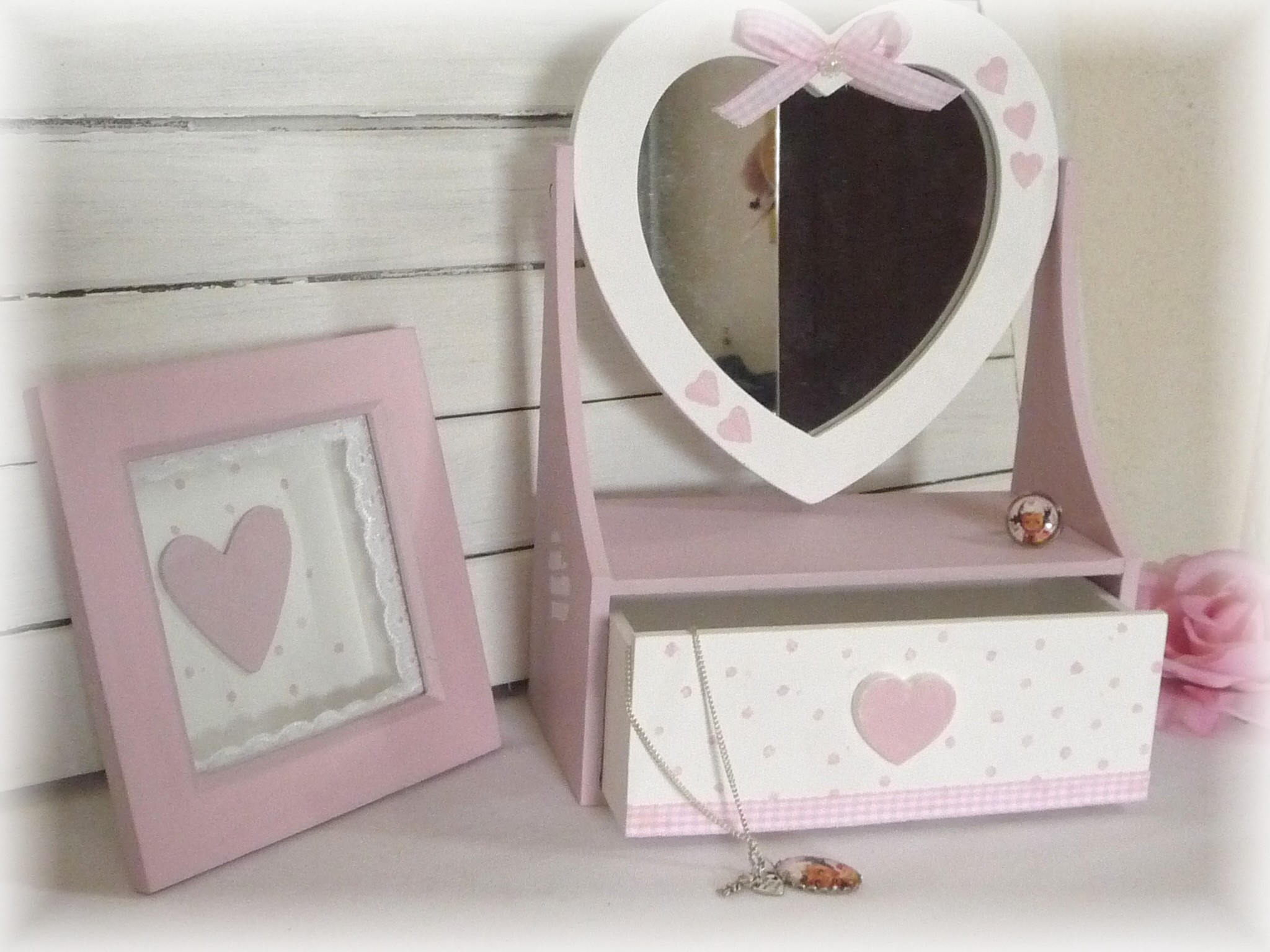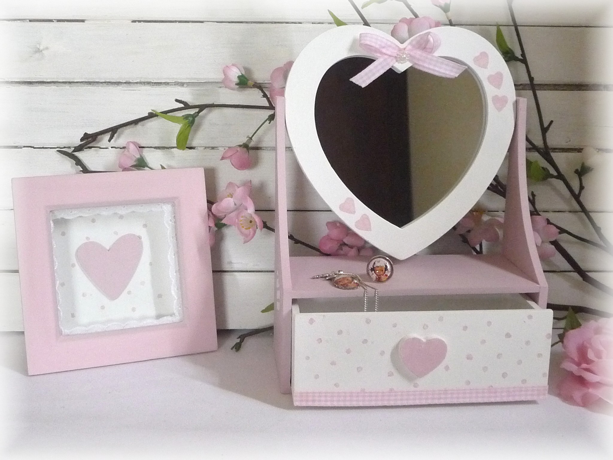 - une boite à bijoux avec miroir dns des tons pastels blanc et rose, coeurs, petit noeud , ruban, demi perles nacrées, crochet au dos pour la suspendre